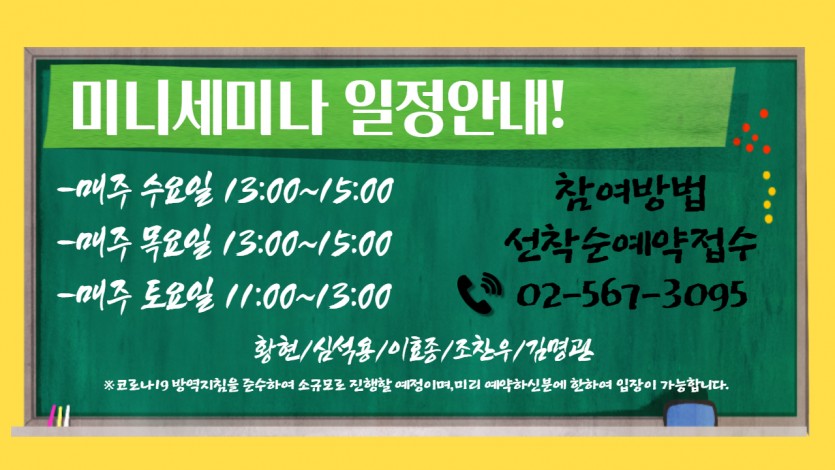 미니세미나 일정안내 페이지 정보 작성자 … 댓글 0건 조회Hit 2,084회 작성일Date 21-03-30 14:55 본문 예약은 필수입니다. 02 - 567 - 3095 목록 답변 이전글세미나 안내 24.11.25 댓글목록 댓글목록 등록된 댓글이 없습니다.